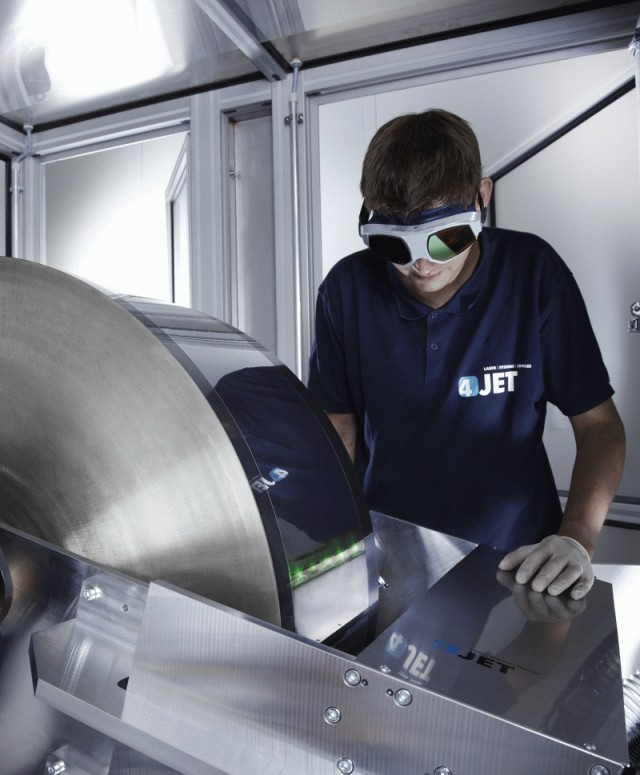 Die Firma 4JET Technologies aus Aachen trägt hauchdünne, leitfähige Schichten auf Kunststofffolien mit einem Laser selektiv ab und strukturiert diese. Diese neue Lösung zur Oberflächenbearbeitung eignet sich zum Beispiel für die Bearbeitung sehr dünner und biegsamer Displays, wie sie etwa in Smartphones oder Tablet-PCs verwendet werden. Auch für andere Produkte und Branchen – wie zum Beispiel organische Leuchtdioden oder die Solartechnologie – bedeutet die Lasertechnik einen großen Fortschritt. So können beispielsweise organische Leuchtdioden auf flexiblen Folien als Beleuchtungselemente völlig neue Möglichkeiten in der Lichttechnik eröffnen.