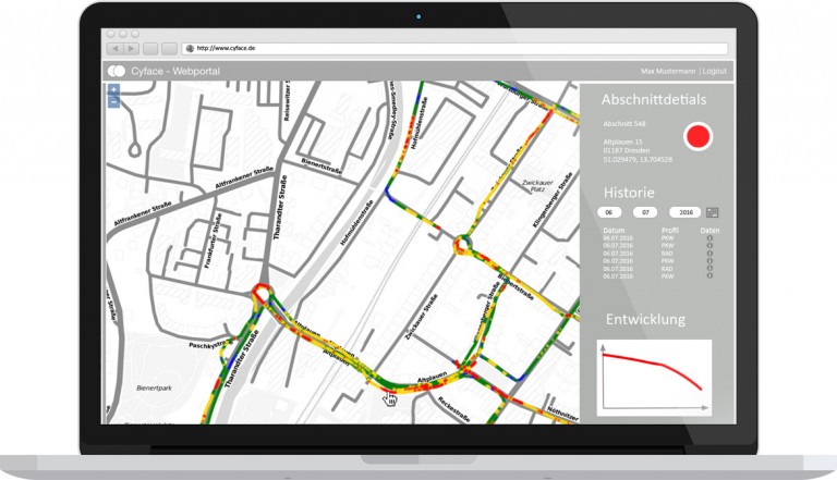 Jeder Bürger hat mit seinem Smartphone und der Cyface-App alles, was es braucht, um zum Datensammler werden. Mit Hilfe von Beschleunigungssensoren, GPS und Gyroskop kann jedes moderne Mobiltelefon die notwendigen Erschütterungsdaten aufzeichnen. Ein Algorithmus verarbeitet die anonymisierten Rohdaten, aggregiert sie und wertet sie aus. So entsteht ein realistisches Bild des Straßenzustandes – nicht durch den Einsatz teurer Messtechnik, sondern durch die Mitwirkung der Bürger. Die Schwachstellen der Verkehrswege zu kennen, lohnt sich gleich doppelt: Denn die Daten dienen zum einen als Entscheidungsgrundlage zur Ausbesserung der Straßen, zum anderen für eine intelligente Navigation, die bei der Routenplanung fehlerhafte Wege vermeidet.