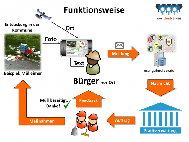 Ob Glasscherben auf dem Gehweg oder eine beschmierte Parkbank: Mit der „Mängelmelder-App“ können Bürger Verschmutzungen, Reparaturfälle oder Gefahrenquellen direkt der kommunalen Verwaltung melden – und das rund um die Uhr. Die Technik unterstützt nicht nur die Stadt bei ihrer Arbeit, sondern stärkt auch den Gemeinschaftssinn: Jeder kann sich für sein Viertel und dessen Bewohner einsetzen. Per App können Bilder, Kurzbeschreibungen sowie die Koordinaten des Fundes durchgegeben werden. So kann die Stadtverwaltung Missstände schnell und gezielt beheben. Die Apps gibt es bereits in vielen deutschen Städten. Hier erhalten Sie Eindrücke von der Preisverleihung
