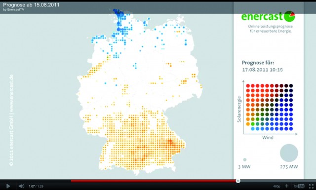 Die erzeugte Menge von Strom aus Wind- und Fotovoltaikanlagen ist nicht steuerbar. Eine zuverlässige Prognose tatsächlich produzierbarer Energie ist für Erzeuger, Netzbetreiber, Händler, Versorger und Konsumenten daher äußerst wertvoll. Die vom Fraunhofer-Institut für Windenergie und Energiesystemtechnik IWES entwickelte Berechnungsmethode „enercast.de“ liefert Ertragsprognosen für Windkraft- und Solaranlagen von bis zu 72 Stunden im Voraus. Die Kalkulation basiert auf den Vorhersagen europäischer Wetterdienste. Sie liefert präzise Ergebnisse, mit denen Stromerzeuger planen und die kontinuierliche Versorgung mit Strom aus Wind und Sonne sichern können.