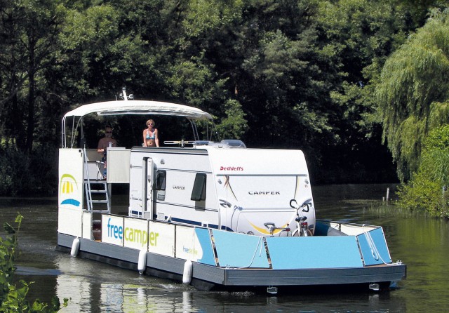 Ein neuartiges Floß bringt den Wohnwagen aufs Wasser.