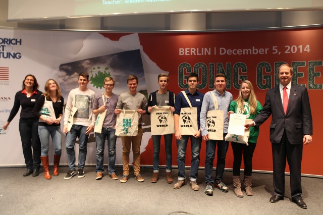 Englischunterricht einmal anders: Statt über Büchern und Vokabelheften zu brüten, vernetzen sich Schüler beim Lernprojekt Going Green mit Partnerschulen und Experten in den USA, um lokale Projekte zu globalen Umweltthemen umzusetzen. Dabei entwickeln sie nicht nur eine App für die Suche nach lokalen Lebensmitteln oder drehen Videos darüber, wie man Ökokosmetik selbst herstellen kann. Sie erarbeiten sich auch ganz nebenbei ein umfangreiches Vokabular, das ihnen im klassischen Unterricht kaum untergekommen wäre. Sustainability, Nachhaltigkeit, ist für sie kein Fremdwort mehr – ebenso wenig wie Medienkompetenz und interkulturelles Arbeiten. Hier erhalten Sie Eindrücke von der Preisverleihung.