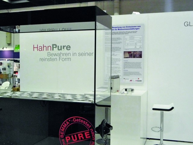 Museumsvitrinen dienen dem Schutz wertvoller Ausstellungsgegenstände vor äußeren Einflüssen. Doch wer hätte gedacht, dass auch die Werkstoffe der Vitrine selbst Kunstwerken Schaden zufügen können? So dünsten viele Vitrinen Gase aus, die anschließend die kostbaren Exponate schädigen. Das Unternehmen Glasbau Hahn stellt unter dem Namen „Hahn Pure“ emissionsreduzierte Vitrinen her. Dazu werden alle für die Herstellung infrage kommenden Werkstoffe auf Schadstoffemissionen getestet und analysiert. Jede Vitrine wird mit einem Probenentnahmeportsystem geliefert, durch das jederzeit Luftproben entnommen werden können. So besteht die Möglichkeit, bei geschlossener Vitrine qualifizierte Untersuchungen durchzuführen, die Aufschluss über Emissionen im Vitrineninnenraum sowie etwaige toxikologische Belastungen des ausgestellten Objektes geben können.