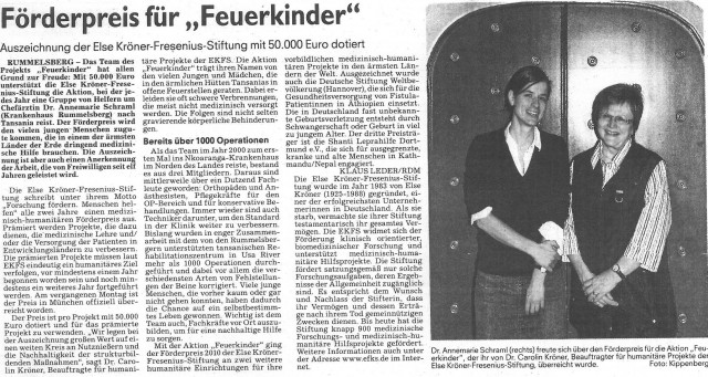 In afrikanischen Dörfern wird häufig an offenen Feuerstellen gekocht. Kinder erleiden dabei immer wieder Verbrennungen, die mangels medizinischer Hilfe zu großflächigen Narben führen und die Gesundheit beeinträchtigen. Ärzte des Krankenhauses Rummelsberg haben deshalb das ehrenamtliche Hilfsprojekt „Feuerkinder“ initiiert und nehmen sich mit unterschiedlichen kreativen Techniken des Schicksals dieser Kinder an. Seit zwölf Jahren reist ein stetig wachsendes Team von Ärzten, Krankenschwestern, Physiotherapeuten und Handwerkern für einige Wochen nach Tansania, um die Versorgung der jungen Patienten im Nkoaranga-Krankenhaus zu gewährleisten. Darüber hinaus bildet das Ärzteteam vor Ort Fachpersonal aus und leistet damit Hilfe zur Selbsthilfe.