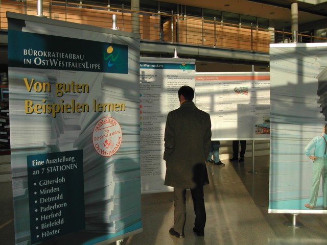 Man muss es nur machen. Die OstWestfalenLippe Marketing GmbH war es leid, dass sich Wirtschaft und Verwaltung ständig miteinander herumärgerten, um überflüssige Auflagen zu erfüllen. Also gründete sie 2002 die Initiative „Wirtschaftsnahe Verwaltung“. Die Idee: Durch konkrete Vorschläge sollten Impulse für weniger und einfachere Vorschriften gegeben und die Leistungen der Verwaltungen für die Unternehmen verbessert werden. Ein Wunder: Es funktioniert. Nun gibt es in den Behörden Anlaufstellen, Verfahrenskoordinatoren und Servicegarantien. Der Landtag NRW erklärte OWL (Ostwestalen-Lippe) 2004 einstimmig zur „Modellregion für Bürokratieabbau“ und setzte dort für drei Jahre bestimmte Vorschriften aus, um zu sehen, ob alles im Chaos versinkt. Das Durcheinander blieb aus. Im Mai 2005 hat der Bund ein „Gesetz zur Umsetzung von Vorschlägen zu Bürokratieabbau und Deregulierung aus Regionen“ verabschiedet. Viele Vorschläge aus OWL sind mit dabei. Am 21. September setzt OWL ein Zeichen für den Bürokratieabbau: Aktenberge werden zerschreddert und zu einem „Monument für Bürokratieabbau“ verformt.