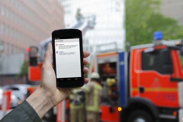 Beißender Geruch liegt in der Luft über dem Wohngebiet – auf einem nahegelegenen Fabrikgelände brennt es. Das Handy piepst: „Warnung der Feuerwehr, gültig ab sofort, Fenster geschlossen halten.“ Früher heulten in Notfällen Sirenen – eine neue Warnmethode, gemeinsam entwickelt vom Fraunhofer-Institut FOKUS und den öffentlichen Versicherern, nutzt die Vorzüge von Internet und Handy: Mit dem System KATWARN informieren Feuerwehr und Katastrophenschutzbehörden Bürger per SMS, E-Mail oder Smartphone-App über Unglücksfälle wie Großbrände, Stromausfälle oder Bombenfunde. Registrierte Nutzer erfahren, was in ihrem Postleitzahlenbereich zu tun ist. So können sie sich und andere schnell in Sicherheit bringen. Hier erhalten Sie Eindrücke von der Preisverleihung