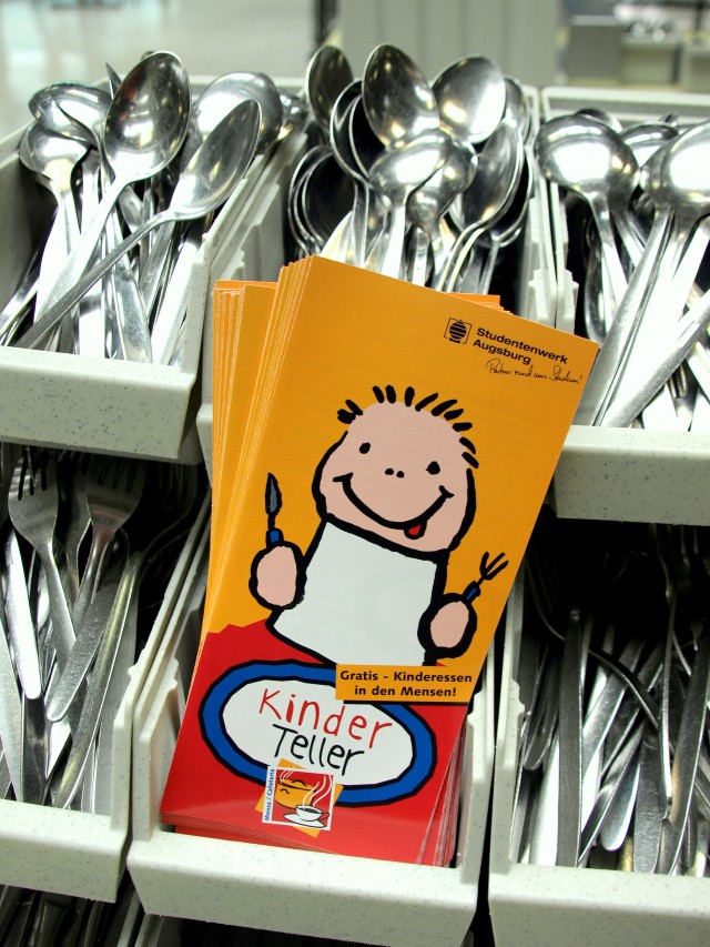 Akademiker bekommen zu wenige Kinder, hat Harald Schmidt einmal beklagt. Am Studentenwerk Augsburg liegt diese Malaise sicher nicht. Denn nirgendwo sonst bekommen Studierende mit Kind ein besseres Angebot: Beim Besuch der fünf Mensen der Universitäten Augsburg, Kempten oder Neu-Ulm ist der Kinderteller für kleine Gäste bis sechs Jahren komplett kostenlos. Das funktioniert ganz einfach: Angehende Akademiker, die ihren Nachwuchs mitbringen, müssen nur an der Mensa-Kasse ihren Ausweis als Pfand abgeben. Im Gegenzug bekommen sie Kinderbesteck und einen bunten Teller. Für die ganz Kleinen stehen genügend Kinderstühle bereit. Egal ob „Gemüsepfanne Mexiko“, Käsepätzle mit Röstzwiebeln oder Germknödel mit Vanillesoße – die Sprösslinge haben die Qual der Wahl aus dem kompletten Angebot der Mensa. Ist die Entscheidung schließlich gefallen, richten die Mitarbeiter der Mensa eine kindgerechte Portion auf dem bunten Teller an. So werden auch die Studenten von morgen satt und der Geldbeutel von Mama und Papa bleibt unangetastet.