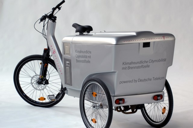 Stau und Parkplatzsuche – für viele Dienstleister in Städten gehört das zum stressigen Alltag. Die Deutsche Telekom hat sich für ihre Außendienstmitarbeiter deshalb etwas Neues einfallen lassen: Das H2-Cargobike kommt schnell voran, hält fit und schont auch noch die Umwelt. Im Aufbau gleicht es einem Fahrrad, dessen hinterer Teil aus einer großen Box mit zwei Rädern besteht. Es besitzt darüber hinaus einen wasserstoffbetriebenen Hilfsmotor. Mit einer Tankfüllung kommt das Cargobike 250 Kilometer weit. Dabei können bis zu 150 Kilogramm Gewicht transportiert werden. Die Servicetechniker des Unternehmens nutzen das Lastenfahrrad in Berlin und Hannover, um Kunden zu besuchen, die in einem Radius von fünf Kilometern ansässig sind. Das hält sie fit und die Umwelt sauber, denn weder Ruß noch CO2 werden von dem dreirädrigen Citymobil ausgestoßen. Zudem tüfteln Mitarbeiter des Bereichs Umweltschutz und nachhaltiger Entwicklung gemeinsam mit dem Hersteller am HYCAIN-Projekt ständig an einer Weiterentwicklung des Fahrzeugs - damit das umweltfreundliche Cargobike immer mehr Nutzer findet.