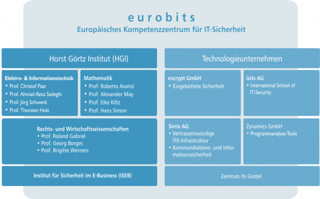 Zwei führende Forschungsinstitute und drei hoch spezialisierte Firmen auf dem Gebiet der IT-Sicherheit sind in einem europaweit einzigartigen Zusammenschluss zwischen Forschung und Wirtschaft integriert. Neben der internationalen Spitzenforschung widmet sich das Kompetenzzentrum eurobits vor allem den Fragen der modernen IT-Sicherheit. Von der Produktentwicklung über maßgeschneiderte Schulungen bis hin zu Firmenansiedlungen unterstützt eurobits seine Kunden. Abgerundet wird das Portfolio durch zahlreiche Studiengänge und Weiterbildungsangebote im Bereich der IT-Sicherheit.