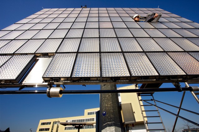 Wenn eine Solarzelle nicht genug Energie erzeugt, müssen eben mehrere kombiniert werden. So einfach ist der Grundgedanke hinter den Mehrfachsolarzellen des Fraunhofer-Instituts für Solare Energiesysteme ISE, die einen Rekordwirkungsgrad von 41,1 Prozent erzielen. Die Technologie selbst ist jedoch nicht ganz so simpel. Drei übereinander liegende Teilzellen mit besonders hoher Leitfähigkeit wandeln jeweils einen begrenzten Wellenlängenbereich des Sonnenlichts besonders effektiv in Strom um. In sogenannten Konzentratormodulen wird das Sonnenlicht dann 500-fach mit Hilfe einer speziellen Linse auf die winzige Zelle fokussiert.