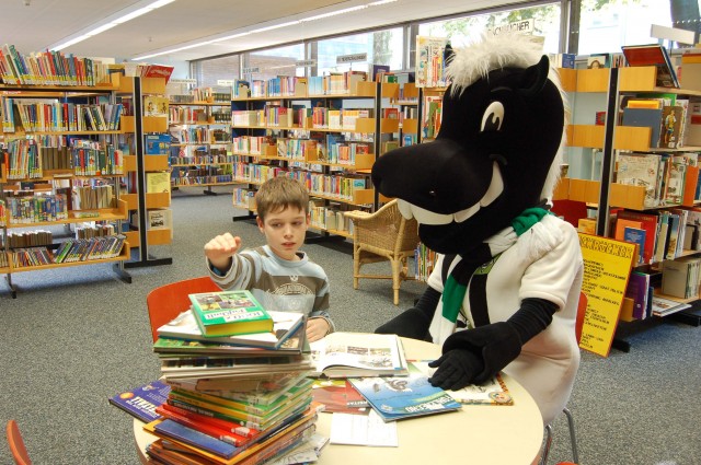 Nicht nur den Körper, sondern auch den Geist trainieren: das möchte eine Initiative der Stadtbibliothek Mönchengladbach. Als Partner konnte sie den bekanntesten Fußballverein der Stadt gewinnen. Das schwarze Fohlen Jünter, Maskottchen von Borussia Mönchengladbach, tourt durch Kitas und Grundschulen und feiert mit den Kindern Lesefeste. Dazu verschenkt Jünter ein Lesepaket mit einem Buch und einem Bibliotheksausweis an jedes Kind. Das Projekt fördert Bibliotheken in den Kitas mit Buchgeschenken im Wert von 1.500 Euro. So wird auch Kindern aus Familien ohne Bezug zum Lesen der Zugang zur Literatur erleichtert.