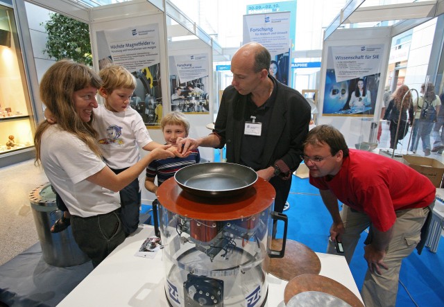 Bratpfannen lernen Fliegen – beim Tag des offenen Labors im Forschungszentrum Dresden-Rossendorf. Eigentlich ein relativ simples magnetisches Experiment, aber es zeigt den Besuchern, was Forschung alles bewegt. Das Zentrum verfügt schließlich über Europas stärksten Elektromagneten. In Dresden wird aber noch mehr untersucht: Insgesamt sechs Institute bilden den wissenschaftlichen Kern des Forschungszentrums. Von der Radiochemie über die Sicherheitsforschung bis hin zur Strahlenphysik: In allen Bereichen betreiben die rund 250 Wissenschaftler Spitzenforschung und arbeiten an der Umsetzung ihrer Ergebnisse. Ihre Arbeit trägt dazu bei, Computer schneller zu machen oder Digitalkameras mit mehr Speicherkapazität auszustatten. Auch medizinischen Fragen gehen die Wissenschaftler nach, etwa wie Tumorerkrankungen frühzeitig erkannt und wirksam behandelt werden können. Beim Tag des offenen Labors sind jedoch die eigens entwickelten Magnetspulen das Highlight, die für Bruchteile einer Sekunde enorme magnetische Felder von fast 100 Tesla erzeugen – und die Pfannen fliegen lassen.