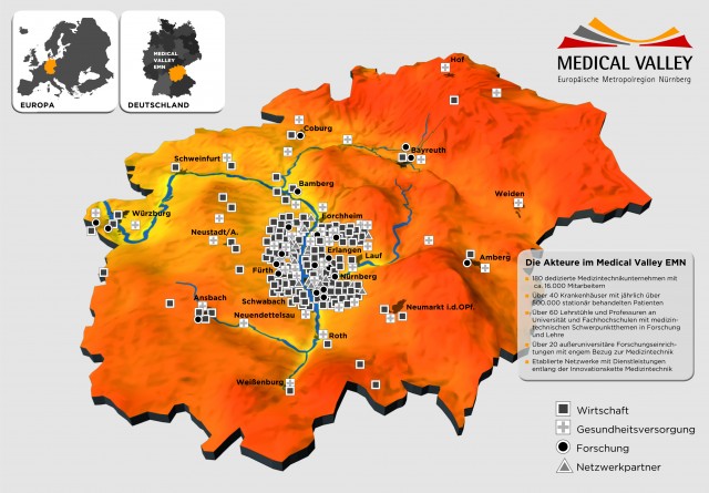 Die Weltbevölkerung wächst, der demografische Wandel schreitet voran und die Erkrankungen nehmen zu – auf diese zentralen Trends müssen sich auch Gesundheitssysteme einstellen. Um bereits heute Lösungen für die Anforderungen der Zukunft zu entwickeln, haben sich mehr als 50 Partner aus dem Medizintechnik-Cluster Medical Valley in der Europäischen Metropolregion Nürnberg (EMN) zusammengeschlossen. Die Experten aus Wirtschaft, Wissenschaft und Gesundheitsversorgung arbeiten in rund 40 Forschungsgruppen gemeinsam an Innovationen für genauere Diagnosen und effizientere Therapien. Dafür wurde das Netzwerk 2010 zum nationalen Spitzencluster ernannt.