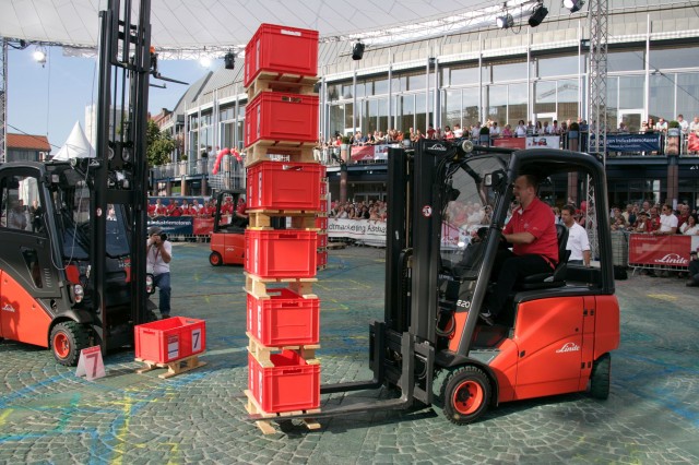 Sie stapeln hoch, vor allem aber schnell: In Aschaffenburg findet zum vierten Mal die Deutsche Meisterschaft der Gabelstaplerfahrer statt. Im Finale des „Linde Stapler Cups“ ermitteln rund 80 regionale Meister den Besten des Landes. Im vergangenen Jahr absolvierten die Finalisten mit dem späteren Meister Jürgen Buslei aus Rheinland-Pfalz gleich mehrere Aufgaben auf sechs Parcours: Wer besteht den Geschicklichkeitstest mit dem nur einige Zentimeter breiten Spezialaufsatz? Wer rangiert dabei die kraftvollen Elektro- und Dieselstapler am effektivsten? Wer setzt am schnellsten Großfässer von einer Palette zur anderen um – und wer ist am Ende vorn? Mit Spannung wird dieses Jahr auch der internationale Teamwettbewerb erwartet. Hier lag die Mannschaft aus China im vergangenen Jahr um einige Gabellängen vor den Spaniern und den Deutschen. Vielleicht klappt es dieses Jahr mit der Revanche. Die 15.000 erwarteten Zuschauer werden die Fahrer beim Finale jedenfalls wieder begeistert anfeuern – und dabei wendige Stapler der allerneuesten Generation in Aktion erleben.