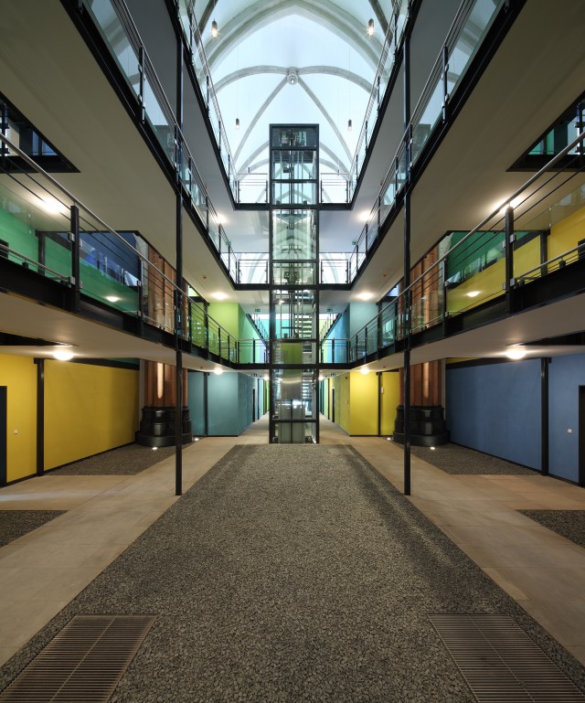 Außen grauer Stein, innen bunte Farben: In der Kirche Herz-Jesu in Mönchengladbach-Pesch haben die Mieter ein ungewöhnliches Zuhause gefunden. Als 2007 zwei Gemeinden des Ortes zusammengelegt wurden, stand der Sakralbau zunächst leer. Die Schleiff Denkmalentwicklung baute im Inneren der Kirche 23 barrierefreie Wohnungen, die vom Land gefördert wurden. Niedrige Mietpreise in der Innenstadt waren sowohl für Studenten als auch Rentner der Grund, in die Kirche zu ziehen. Nach außen blieb der denkmalgeschützte Bau erhalten. Im Inneren ist die Wohnkirche dank nachhaltiger Konzepte startklar für die Zukunft.