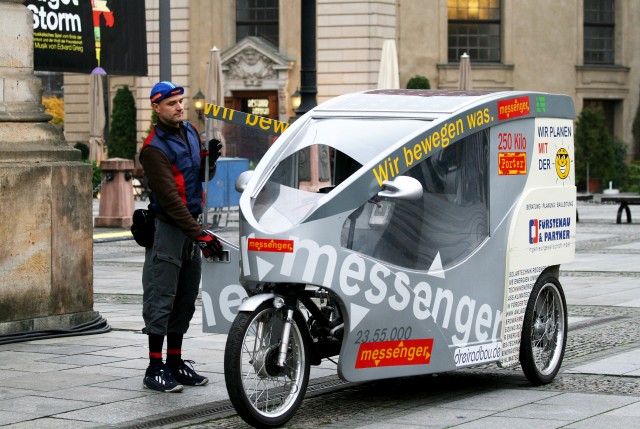 Er besitzt drei Räder, eine wetterbeständige Kunststoffkabine und strampeln kann man zwar, muss man aber nicht. Der Cargo-Cruiser ist mit einem durch Solarenergie betriebenen Elektromotor ausgestattet, der beim Anfahren und am Berg die Beine entlastet. Die wichtigste Eigenschaft dieses überdimensionierten Dreirads ist aber eine andere: Der Cargo-Cruiser kann es mit Lasten aufnehmen, die bislang Kleintransportern vorbehalten waren. Eine Europalette mit einer Ladung von maximal 250 kg lässt sich mit dem Cargo-Cruiser ohne Weiteres bewegen, allein mit Muskel- und Solarkraft. Während Getränkekisten für den Fahrradtransport eher problematisch sind, nimmt es der Cargo-Cruiser selbst mit schweren und mitunter sperrigen Möbelstücken auf. Die Vorteile für das vom Transportunternehmen messenger entwickelte Gefährt liegen also auf der Hand: Es ist leise, umweltfreundlich, kostengünstig und bringt auch schwere Güter leichtfüßig an ihren Bestimmungsort. Kurzum, eine echte Alternative zum Auto.