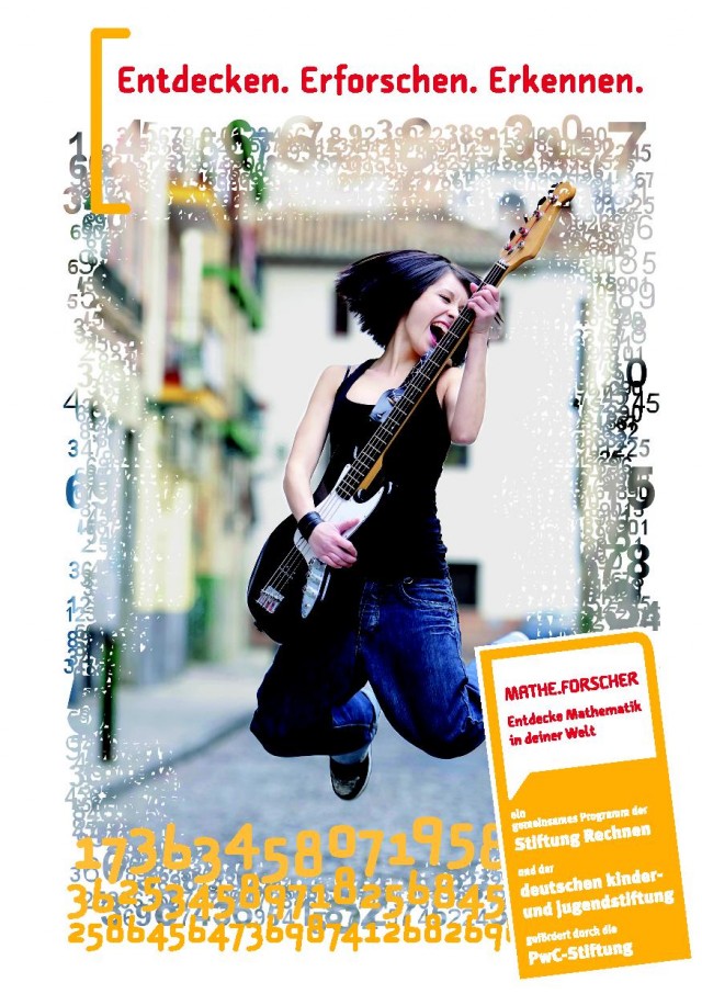 Was hat Hockey mit Mathe zu tun? Welche geometrischen Formen finde ich in meiner Stadt? Schüler der Sekundarstufe I sowie Lehrer erarbeiten im Rahmen des Projekts „Mathe.Forscher“ der Deutschen Kinder- und Jugendstiftung und der Stiftung Rechnen einen neuen Zugang zur Mathematik. Dabei werden Kultur- und Alltagsphänomene in Modellschulen mathematisch erforscht. Kinder haben durch die innovative Herangehensweise mehr Spaß an der oft trockenen und komplizierten Materie. Regelmäßig finden Netzwerktreffen statt, bei denen sich die Beteiligten austauschen können. Das Projekt wirkt dem Fachkräftemangel im naturwissenschaftlichen Bereich entgegen. Mathe.Forscher ist ein gemeinsames Programm der Stiftung Rechnen und der Deutschen Kinder- und Jugendstiftung, gefördert durch die PwC-Stiftung.