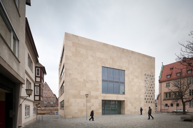 Gegenüber dem weltberühmten Ulmer Münster hat seit 2012 die neue Synagoge am Weinhof ihre Pforten geöffnet: ein 17 Meter hoher Kubus, dessen glatte Kalksteinoberfläche Fenster aus Davidsternen zieren. Mitten im Herzen der Stadt gelegen, setzt der Entwurf des Kölner Architektenteams Kister, Scheithauer und Gross ein Zeichen für die Integration der jüdischen Gemeinde in den Alltag der Ulmer Bürger. War die 1938 von den Nationalsozialisten zerstörte Synagoge am Rand des Platzes gelegen, rückt das neue jüdische Gotteshaus städtebaulich ins Zentrum. Hier erhalten Sie Eindrücke von der Preisverleihung