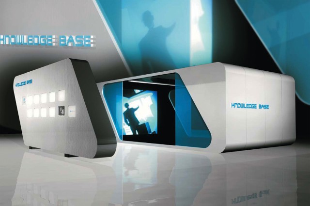Stuttgart und Umgebung sind dank Global Playern wie Daimler-Chrysler, Porsche oder Bosch, aber auch innovativen Mittelständlern eine der führenden Wirtschaftsregionen Europas. Die „Knowledge Base“, entwickelt vom wirtschaftlichen Verein Virtual Dimension Center (VDC) in Fellbach, macht diesen einmaligen Wirtschaftsraum auf Messen, Ausstellungen und Präsentationen virtuell begehbar. Die dreidimensionalen Projektionen der „Knowledge Base“, einer mobilen Informationsplattform für audiovisuelle Installationen, beeinflusst der Betrachter interaktiv mit 3D-Brille und Steuerungsgerät. So beobachtet er zum Beispiel in einer inszenierten Realität in Echtzeit und aus mehreren Betrachtungsperspektiven die Produktionsabläufe und Dienstleistungen innovativer Unternehmen aus der Region. Ziel des VDC ist es, „Knowledge Base“ zum repräsentativen Mittelpunkt des Wirtschaftsraums zu machen: Über die Lebensqualitäten der Region soll der Besucher genauso aufgeklärt werden, wie über Denkmäler, Wirtschaftsdaten und die Zusammenhänge zwischen den Unternehmen.